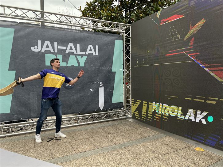 El juego consiste en simular el lanzamiento de la pelota con la xistera atada a la mano derecha. Además, a través de un QR, que te lleva a eitb.eus, se podrá conseguir el video con el lanzamiento.