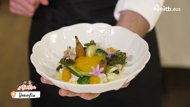 Merluza asada sobre salsa de calabaza y hortalizas al vapor