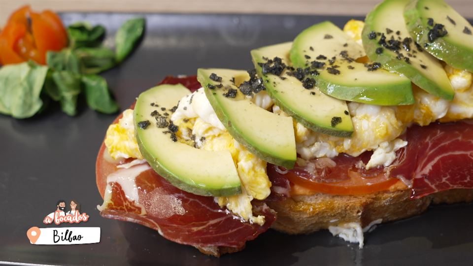 Tosta de tomate, aguacate, huevo revuelto y jamón en Café Brämar de Bilbao
