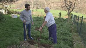 Benjamín, con 87 años, y Joseba Arguiñano han cortado leña para afrontar con garantías lo que queda de invierno y, además, han removido estiércol en la tierra de la huerta.