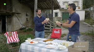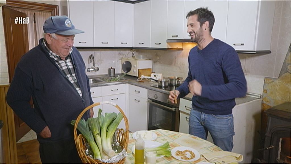 Mariano cuida su huerta cada día desde que vino a Euskal Herria y, junto a los productos que planta y contando con la ayuda de Arguiñano, ha preparado una crema de puerros con huevo poché.