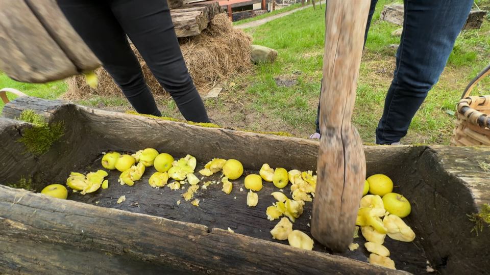 Antiguamente, se utilizaba el pisón para machacar la manzana, mientras se cantaba la canción 'Kirikoketa'. La pacha la llevaban a una prensa primitiva, tal y como nos lo han mostrado Leire Alkorta y Ainize Mitxelena, del Sagardoetxea, además de hablarnos de varias curiosidades en torno a la sidra.