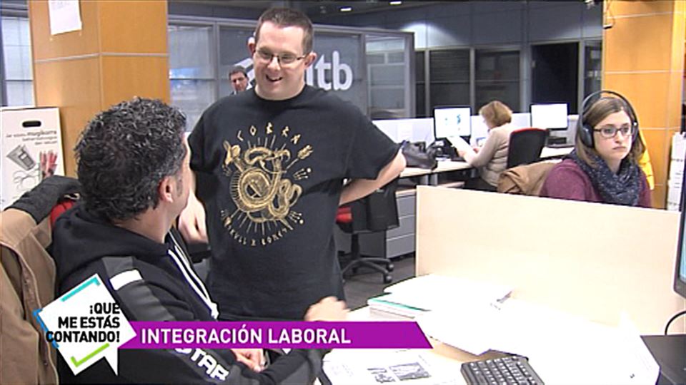 Gontzal Yañez tiene síndrome de Down y trabaja en Radio Vitoria desde hace 15 años. Se dedica a sacar fotos a invitados, repartir cartas, sacar fotocopias… Es un claro ejemplo de integración laboral.