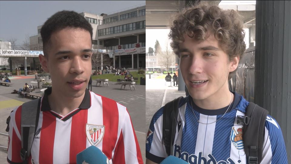 Visitamos el campus de Leioa de Euskal Herriko Unibertsitatea para ver el particular duelo de camisetas de la Real y del Athletic que han vestido las y los estudiantes para animar a sus equipos en este partido de vuelta de la semifinal de la Copa del Rey.