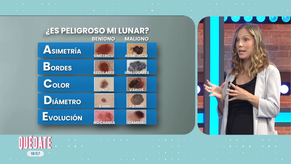 La dermatóloga Ane Barrutia nos habla sobre los peligros del sol en la piel. Nos habla sobre los distintos lunares que solemos tener y nos explica en qué tenemos que fijarnos. Hay que mirar si son asimétricos, los bordes, su color, su diámetro y su evolución.