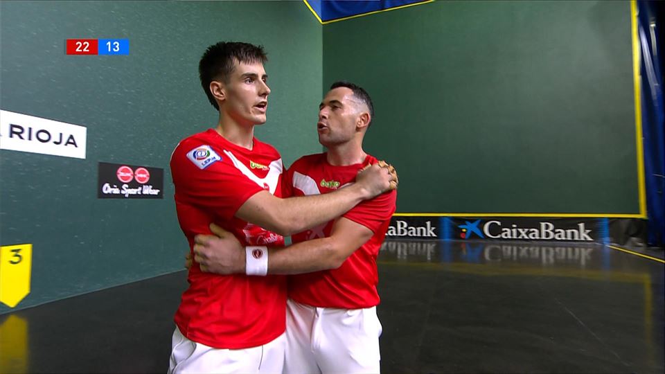 Erik Jaka eta Martxel Iztueta 22-13 gailendu zaizkie Iker Larrazabali eta Jon Mariezkurrenari Logroñoko Adarraga pilotalekuan jokatu duten partidan, eta, horrenbestez, lehen puntua bereganatu dute San Mateo torneoko ligaxkan.